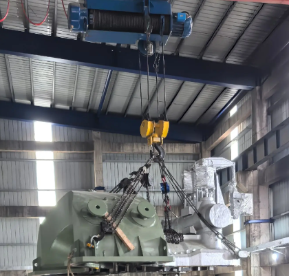 起吊指令下達后,鋼絲繩電動葫蘆緩緩啟動。吊鉤穩穩鉤掛卸扣吊環,在操作人員的精準操控下,設備平穩脫離地面。此時,地面監護人員密切觀察鋼絲繩受力狀態與設備平衡度,電動葫蘆沿著預設軌道緩慢移動,將設備運送至安裝工位正上方。整個過程中,設備懸停平穩,無晃動偏移,充分展現了電動葫蘆的精準控制性能。